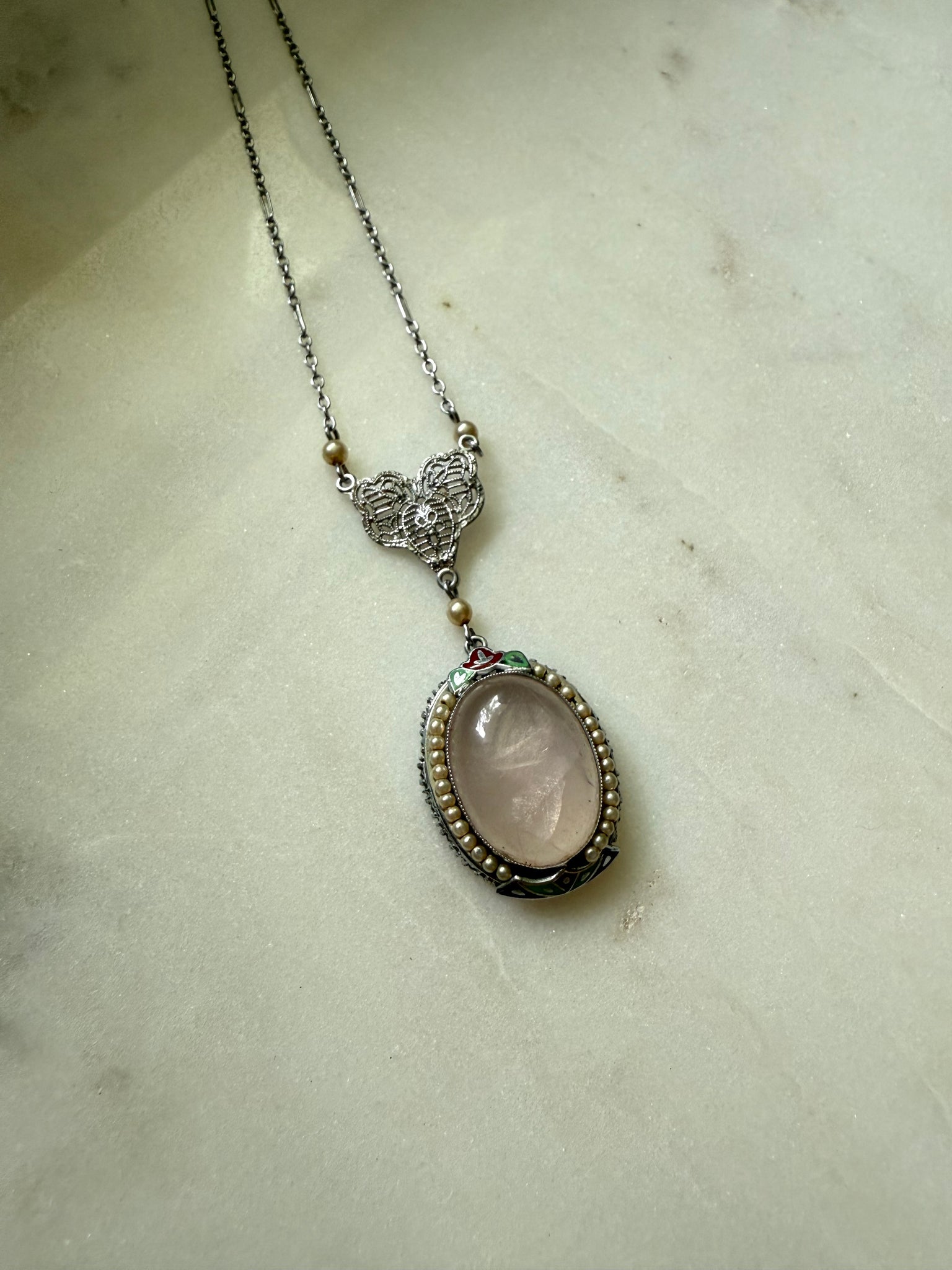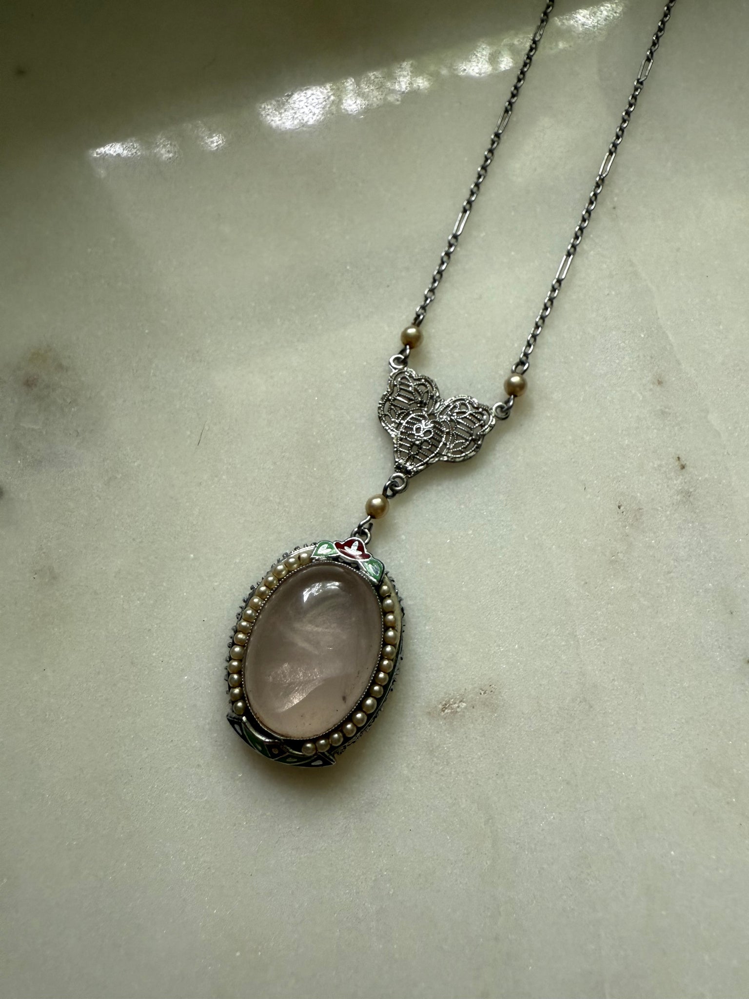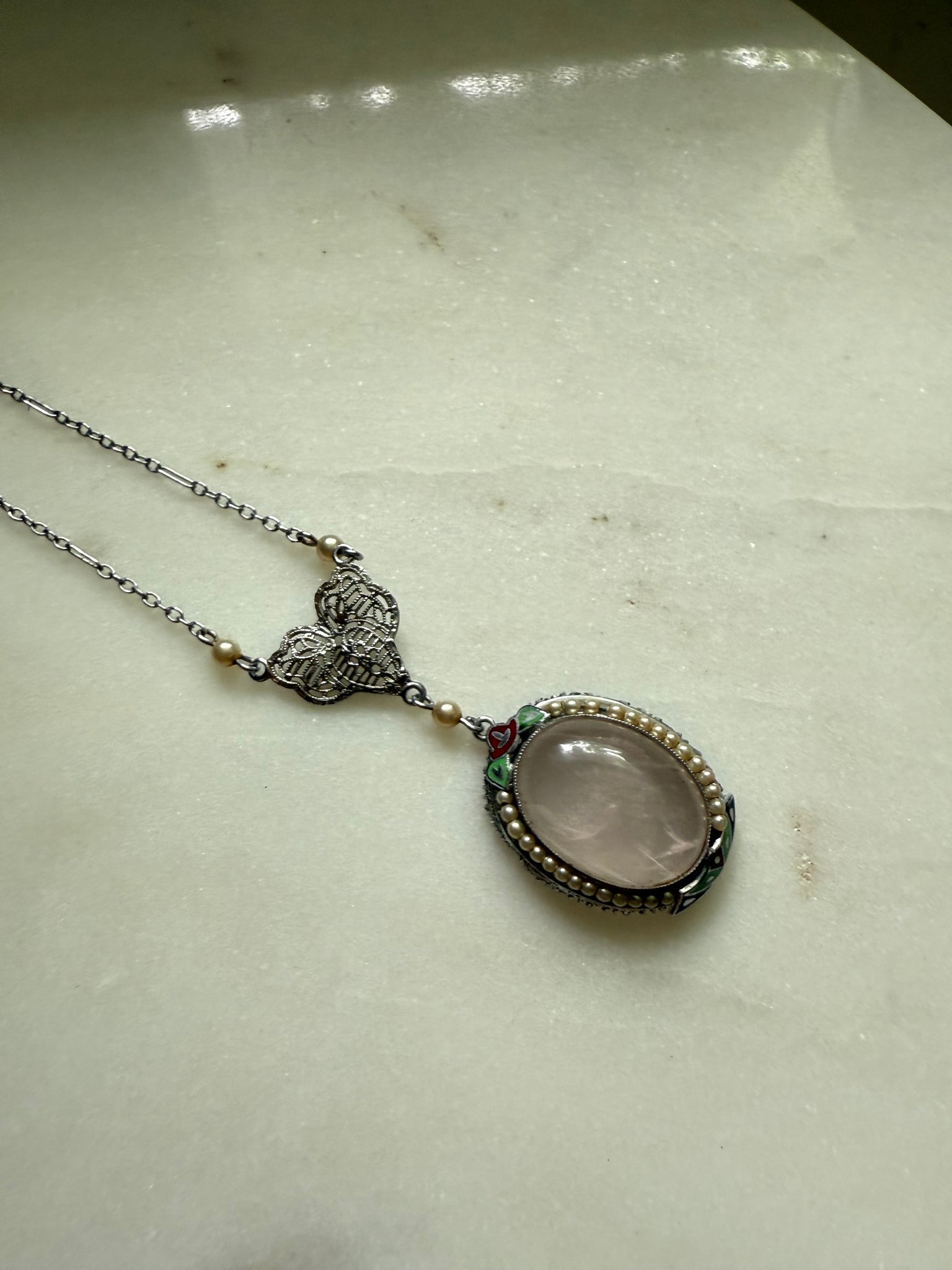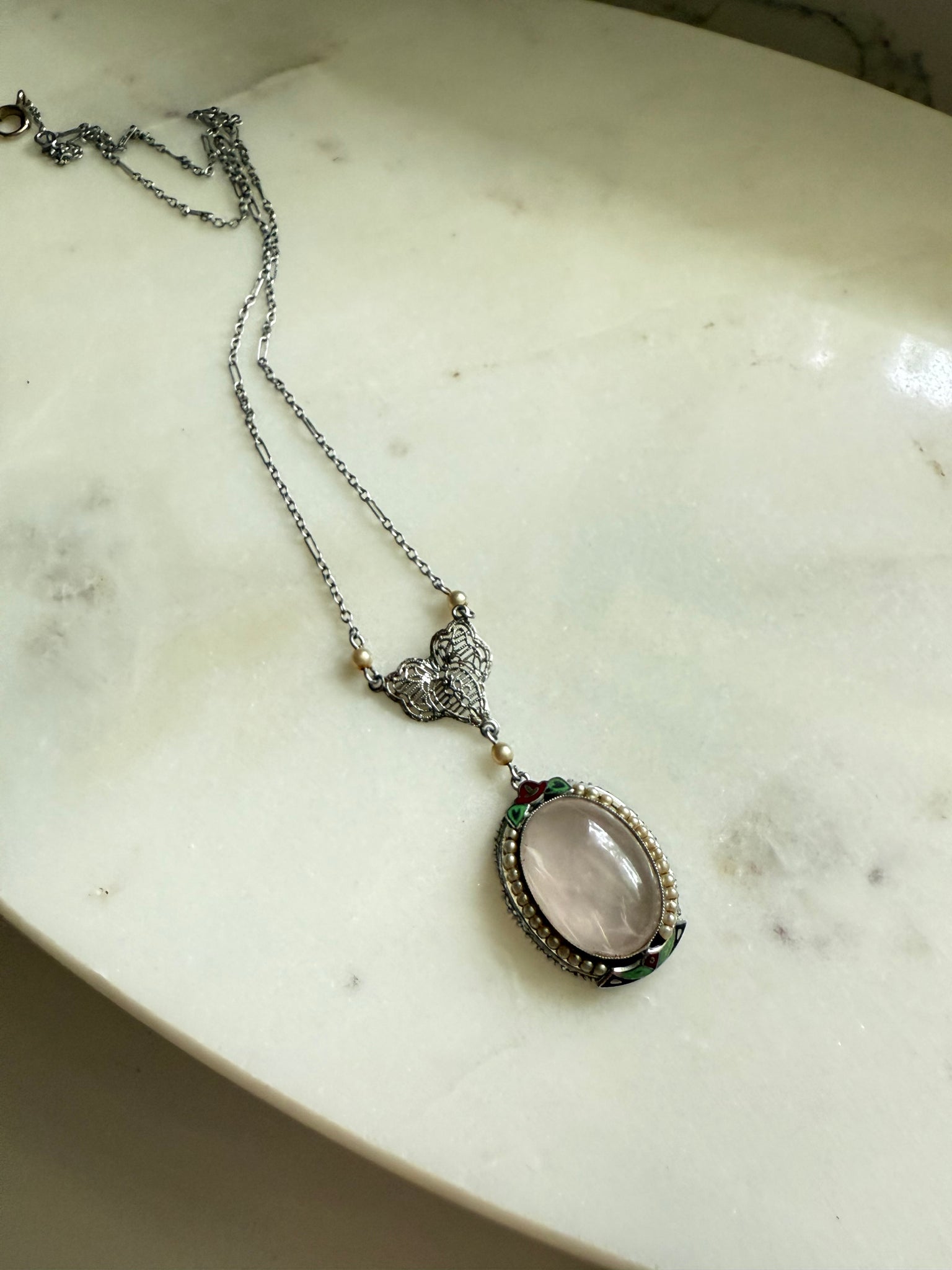 10k White Gold Enamel Rose Quartz Seed Pearl Necklace
