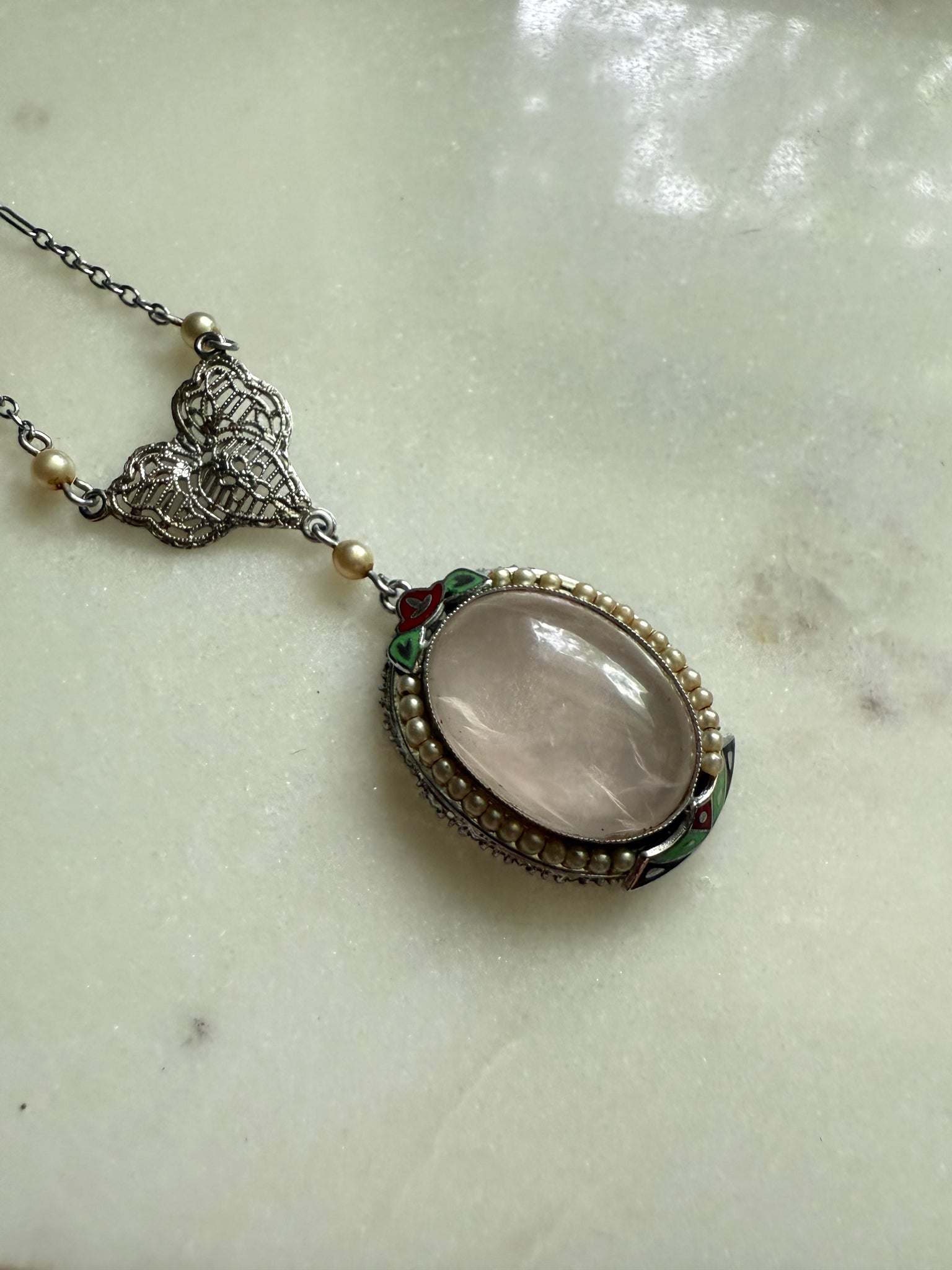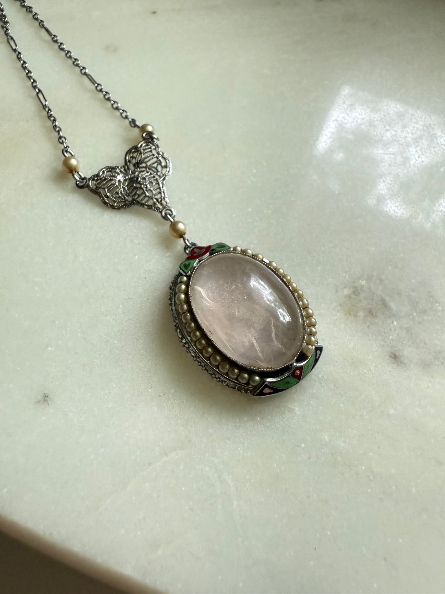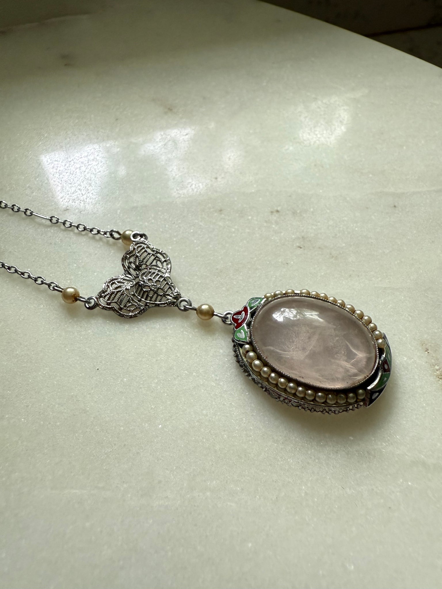 10k White Gold Enamel Rose Quartz Seed Pearl Necklace