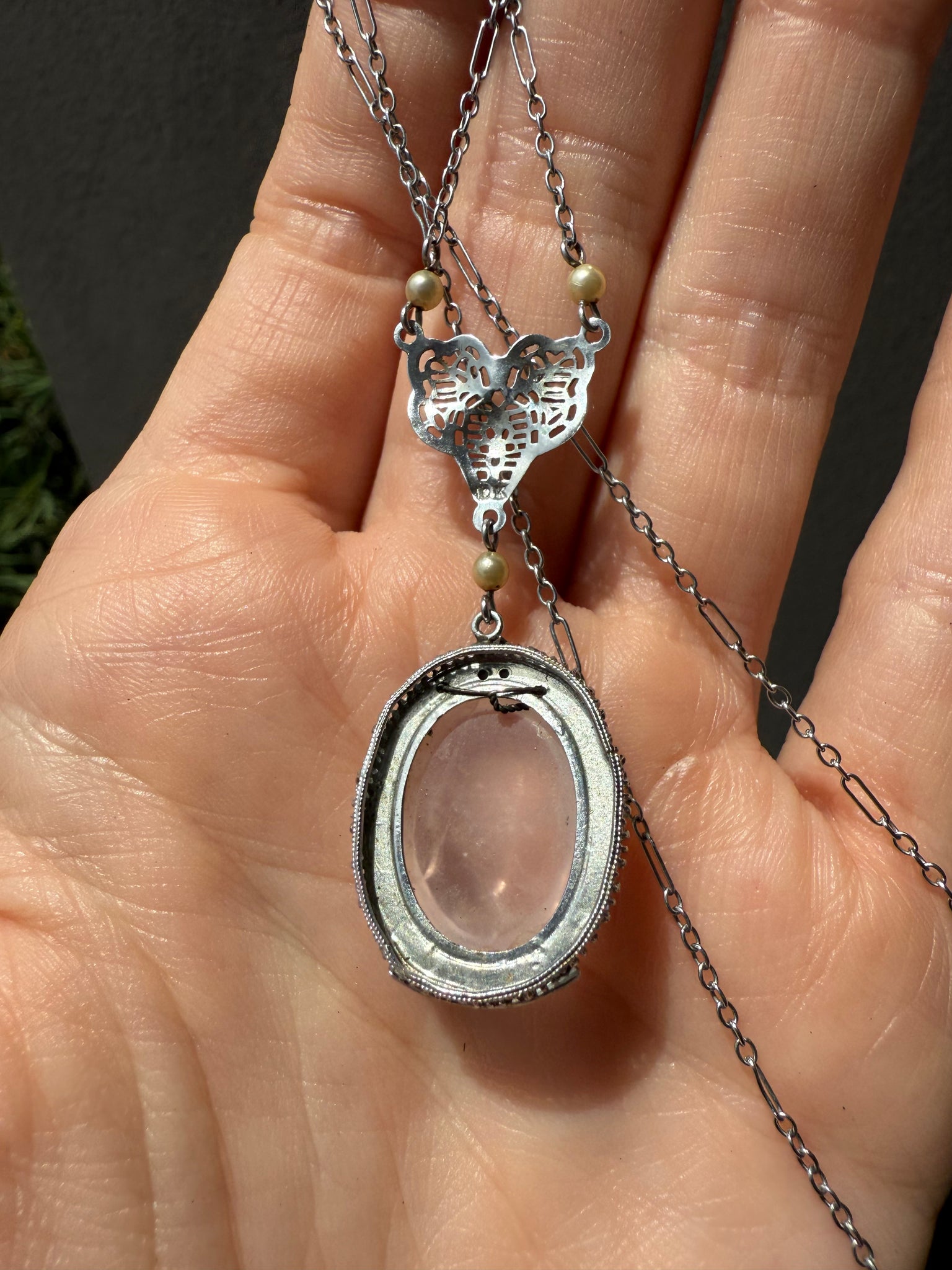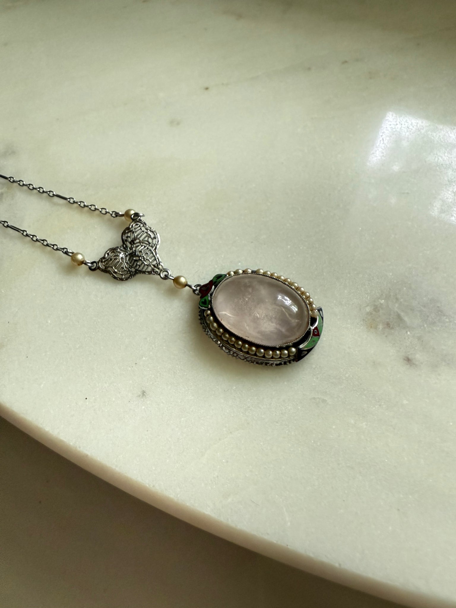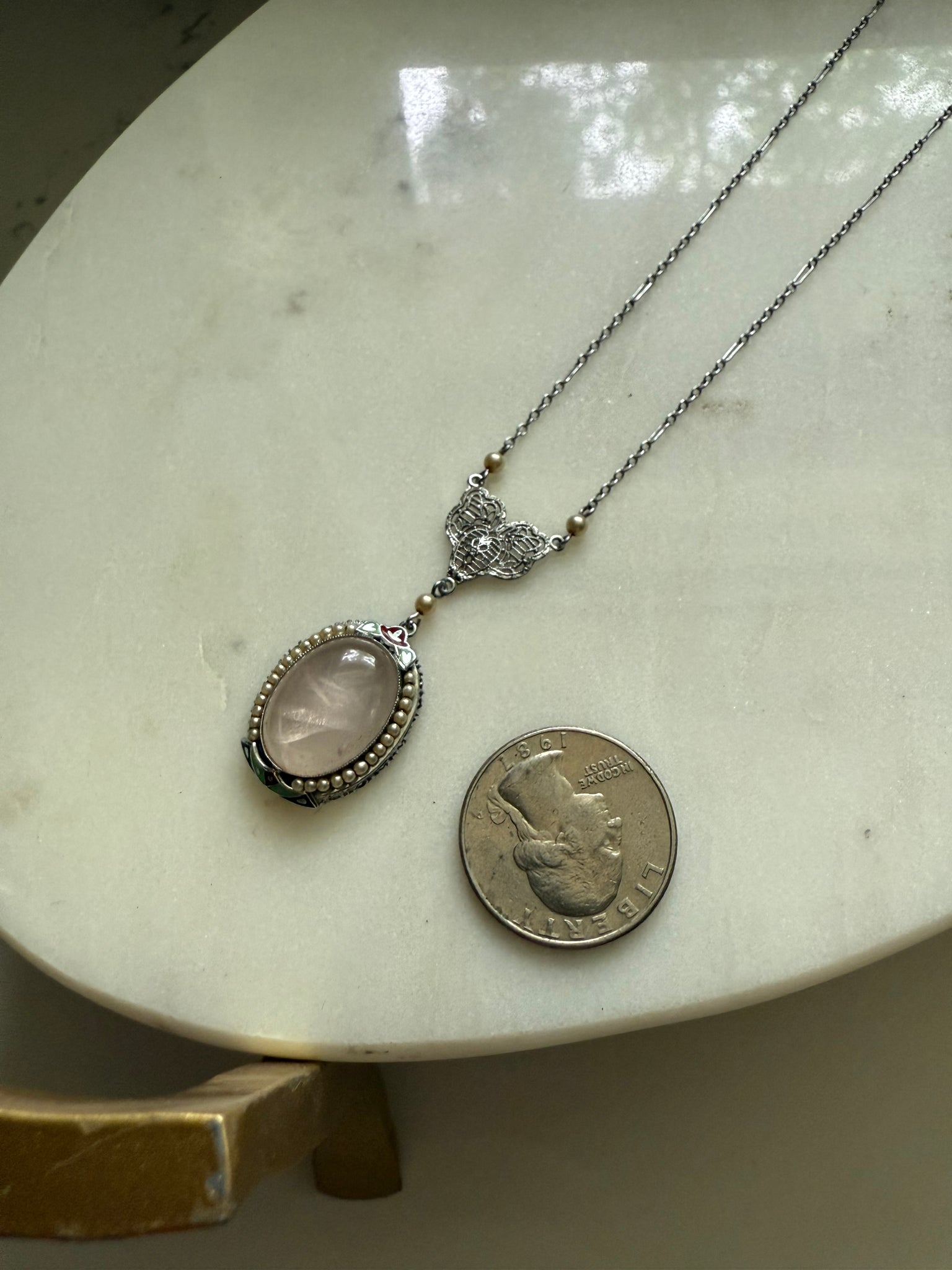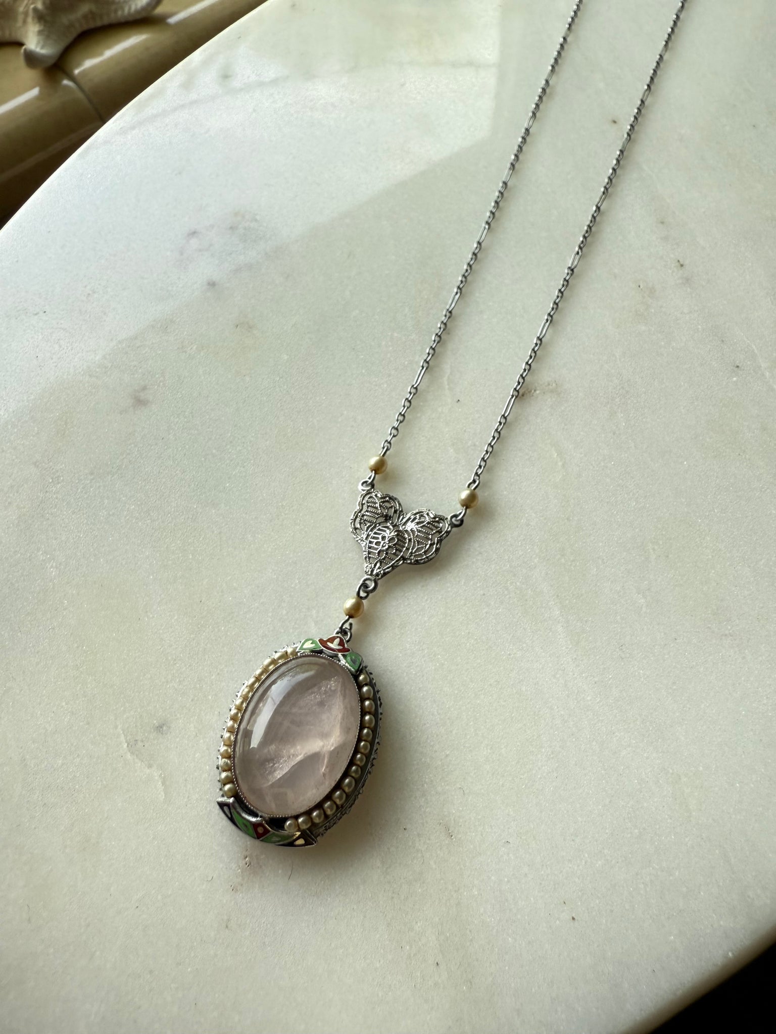 10k White Gold Enamel Rose Quartz Seed Pearl Necklace